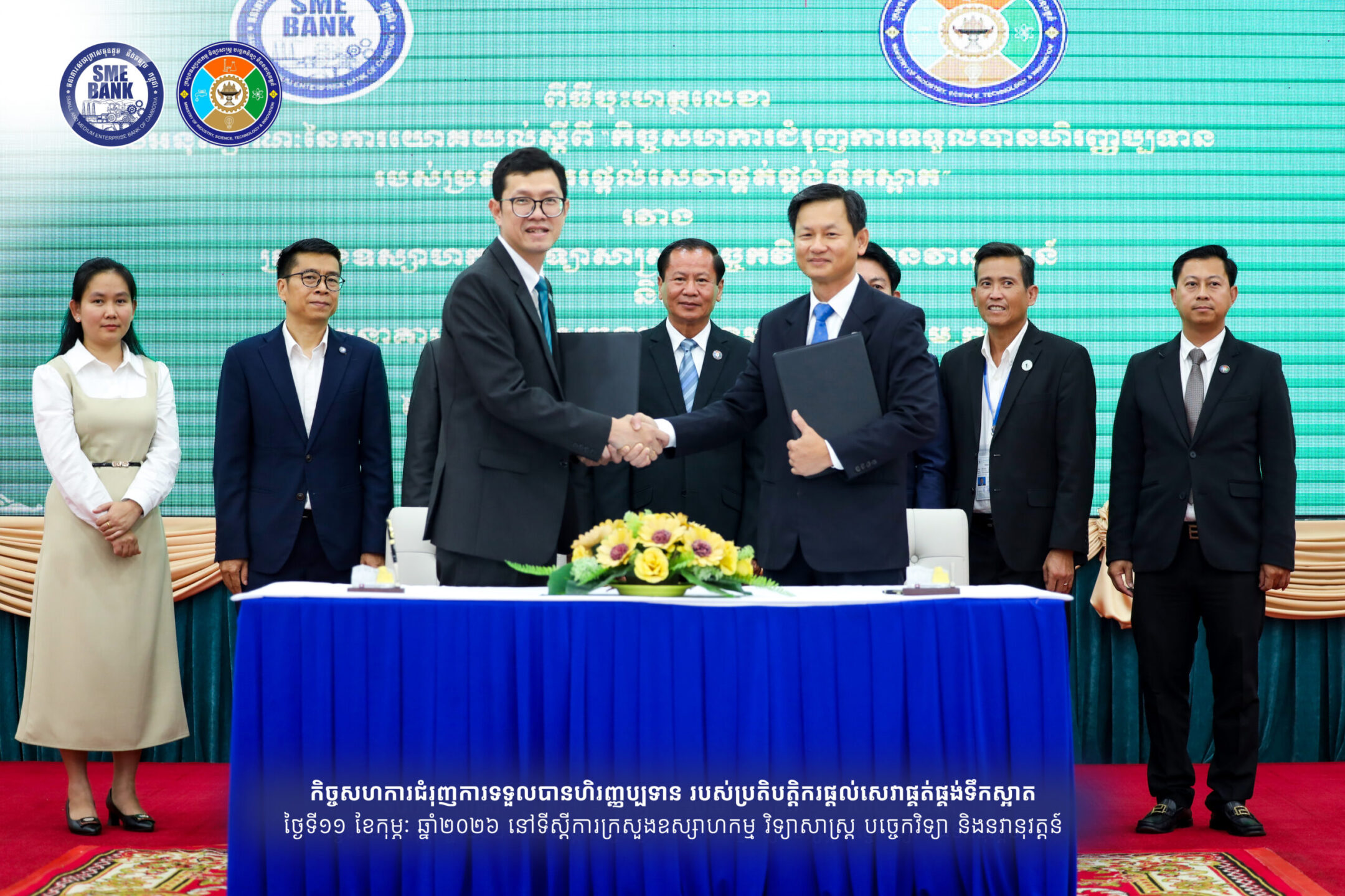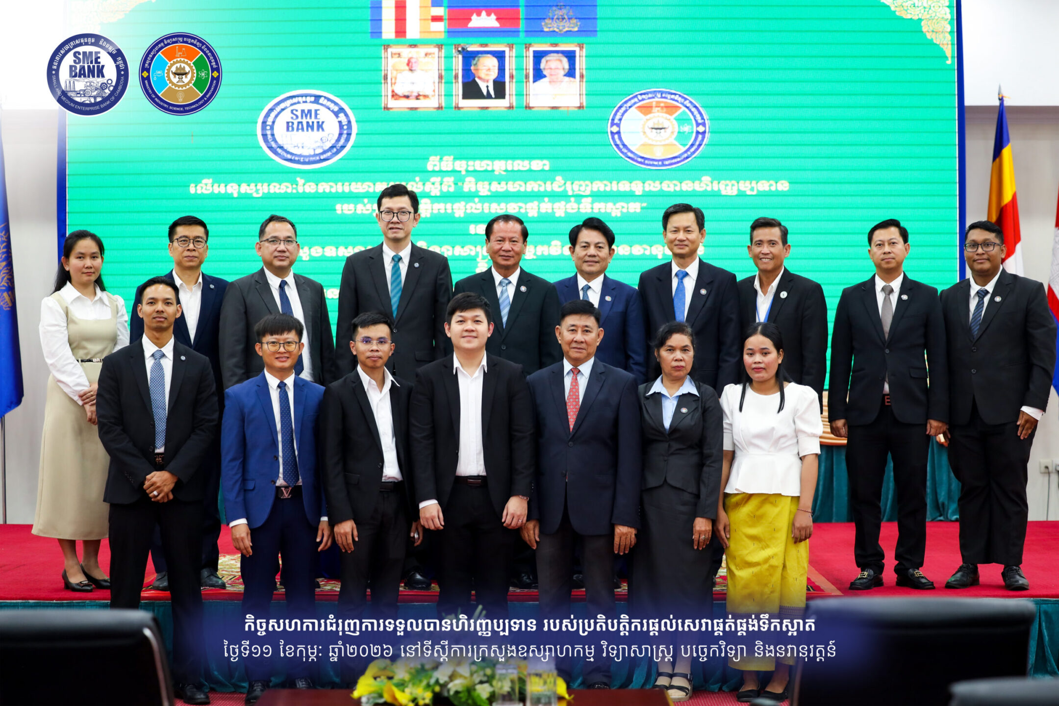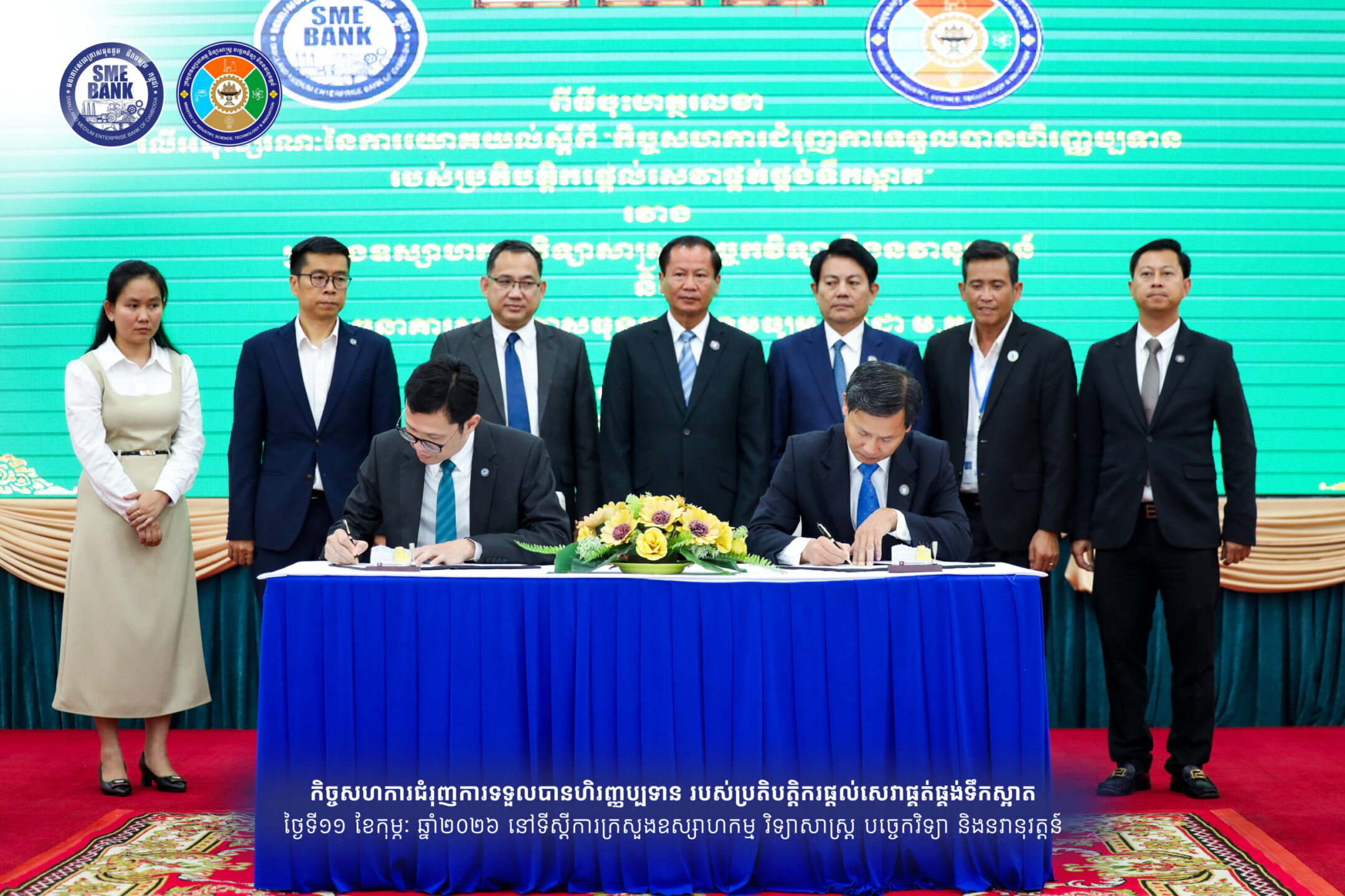 ភ្នំពេញ, ថ្ងៃទី១១ ខែកុម្ភៈ ឆ្នាំ២០២៦, ធនាគារ SME និងអគ្គនាយកដ្ឋានទឹកស្អាត នៃក្រសួងឧស្សាហកម្ម វិទ្យាសាស្ត្រ បច្ចេកវិទ្យា និងនវានុវត្តន៍ បានរៀបចំពិធីចុះហត្ថលេខាលើអនុស្សរណៈនៃការយោគយល់ ស្តីពី “កិច្ចសហការជំរុញការទទួលបានហិរញ្ញប្បទាន របស់ប្រតិបត្តិករផ្តល់សេវាផ្គត់ផ្គង់ទឹកស្អាត”